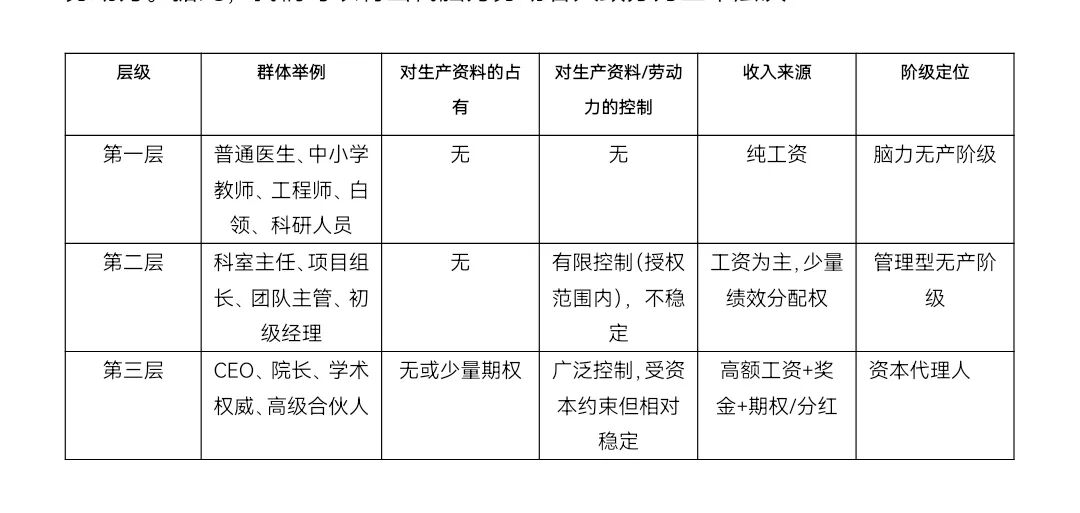 要分析小资产阶级意识形态左翼,我们首先需要一个清晰的阶级划分标准。这里采用的标准有两个核心维度:是否占有生产资料,以及能否稳定控制生产资料或劳动力。据此,我们可以将当代脑力劳动者大致分为三个层次: