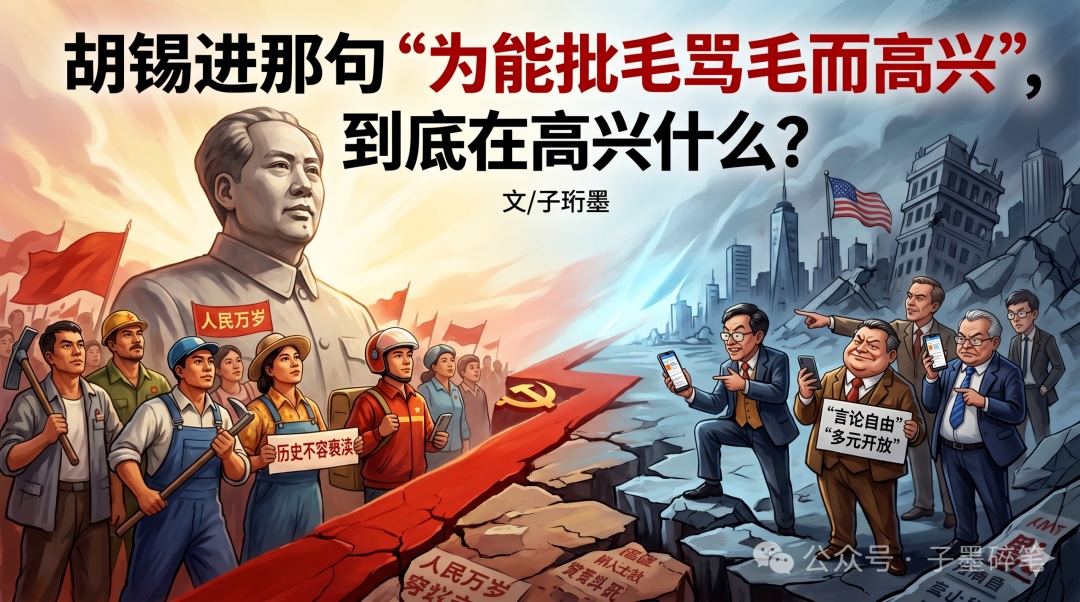 文/子珩墨 同志们好,我是子珩墨。 最近,在互联网的故纸堆和某些大V的言论截图中,我再次看到了胡锡进当年那句极为刺眼、甚至可以说是令人作呕的“名言”: “为今天的中国能在这里公开批毛骂毛而高兴。” 这句话,带着一种居高临下的、自诩为“开明绅士”的优越感,带着一种向所谓西方自由主义价值观暗送秋波的谄媚。 很多同志不解,甚至感到出离的愤怒:我不知道胡锡进为中国人能批判拯救一个民族的伟人,能骂一个救万民于水火之中的大救星,到底在高兴个啥? 他是在庆幸这个国家的底线已经被彻底击穿?还是在炫耀自己作为“理中客”那副刀枪不入的政治软骨头? 这篇文章,我们不妨借助唯物史观的视角,将这句看似“包容”的说法慢慢拆开,或许可以更清楚地看到,它背后所依附的立场与取向。 一 首先,我们要搞清楚一个最基本的问题:在这个国家,到底是谁在“批毛骂毛”? 是那些在富士康流水线上昼夜颠倒,把青春一点点交给机器的人吗? 是那些在风雨之间被无形规则紧紧牵住、以奔波换口粮的骑行者吗? 是那些被房贷、医药与求学开支层层压住,在城市与乡野间勉力支撑的人们吗? 绝不是! 最广大的无产阶级和劳动人民,也许受限于受教育程度无法长篇大论地进行理论阐述,但他们有着最朴素的阶级直觉。他们心里比谁都清楚,那个喊出“人民万岁”、把一生都献给劳苦大众翻身解放的老人家,是他们在这片土地上唯一的政治图腾和精神护盾。 真正热衷于“批毛骂毛”,甚至以此为乐、以此为荣的,是怎样一群人? 是那些在旧社会失去了作威作福特权的剥削阶级的孝子贤孙; 是那些在近几十年的浪潮里,借着改换门庭之机占尽先手,在账目与规章的缝隙间积起身家的那一群人; 是那些喝着西方新自由主义的迷魂汤,妄图把中国彻底改造成资本主义附庸的买办文人与公知! 当胡锡进为“能公开批毛骂毛而高兴”的时候,他实际上是在为什么高兴? 他是在为剥削阶级及其代言人终于夺回了话语权而高兴! 他是在为那些射向无产阶级领袖的暗箭和脏水,被合法化、常态化而感到一种“如释重负”的快感。 这种“高兴”,是背叛了劳动人民阶级立场的狂欢,是向资本与西方话语体系递交的一份卑劣的投名状。 二 这帮人喜欢用所谓的“言论自由”和“政治开明”来包装这种纵容。他们试图把老人家降格成一个普通的历史人物,认为既然是历史人物,就可以被随意解构、被随意泼粪。 这是极其阴险的偷换概念。 在中国,毛泽东这三个字,从来不仅仅代表一个具体的个人,他是中国共产党执政合法性的基石,是中华人民共和国的立国之本,是中国人民解放军的军魂! 老人家一生的事业是什么?是带领最底层的奴隶砸碎铁链,是推翻三座大山,是建立一个没有剥削、没有压迫,劳动人民当家作主的社会主义新中国。 毛泽东思想的最大底色,就是人民性。 当你允许、甚至“高兴地看到”有人公开批他、骂他的时候,你实际上是在默许什么? 你是在默许对整个中国革命史的否定; 你是在默许对无数为了建立新中国而牺牲的革命先烈的侮辱; 你是在默许为那些曾经骑在人民头上拉屎撒尿的地主、买办和资本家翻案! 清代学者龚自珍早就说过:“欲知大道,必先为史。灭人之国,必先去其史。” 当一个国家的舆论场,可以任由宵小之徒公开辱骂这个国家的缔造者和民族救星,而某些掌握话语权的媒体人还拍手叫好的时候,这个国家的意识形态防线就已经处于崩溃的边缘了。 他们骂的真的是老人家吗?不,他们骂的是那个让劳动者有尊严的时代,他们骂的是社会主义制度本身。 如果老人家是错的,那么他们今天疯狂敛财、剥削工人、搞阶级固化的那一套,就顺理成章地变成了“对的”。 这就是“批毛骂毛”背后最核心的政治经济学逻辑。 三 我们再来看看胡锡进这种所谓“理中客”的心理机制。 这种人,典型的特征就是患有严重的“政治软骨病”。他们在面对西方帝国主义和国内的公知势力时,总是有一种深入骨髓的自卑感。 他们极度渴望得到西方的“认可”,极度渴望被西方证明中国是一个“开明”、“多元”、“现代”的国家。 而在西方的话语体系里,要证明你的“开明”,最好的方式是什么?就是去解构你的开国领袖,去否定你的革命历史。 于是,胡锡进们便迫不及待地把容忍“批毛骂毛”当成了展示中国“大度”的橱窗。他们像是在对西方的主子摇尾巴:“看啊,我们现在多宽容,我们连自己的大救星都可以任由别人骂了,我们是不是已经符合你们的‘普世价值’了?” 这是一种何等可悲的奴才心态! 你大可以去看看美国。美国敢不敢允许它的主流媒体、国民群体在公共平台上,彻底解构、否定并公开辱骂乔治·华盛顿和林肯,甚至以此为荣? 美国不仅有极其严密的“政治正确”防线,更有隐蔽而强大的意识形态审查机制。谁敢在根本上动摇美国资本主义制度的基石,谁就会面临社会性的死亡。 别人把自己的开国者当成神像一样供奉,哪怕他们是奴隶主、是屠杀印第安人的刽子手; 而我们的某些大V,却为自己国家能公开辱骂那位一生为了穷苦百姓、一家牺牲了多位亲人的千古伟人而“高兴”! 毛主席在《被敌人反对是好事而不是坏事》中早就说过:“如若不被敌人反对,那就不好了,那一定是同敌人同流合污了。如若被敌人反对,那就好了,那就证明我们同敌人