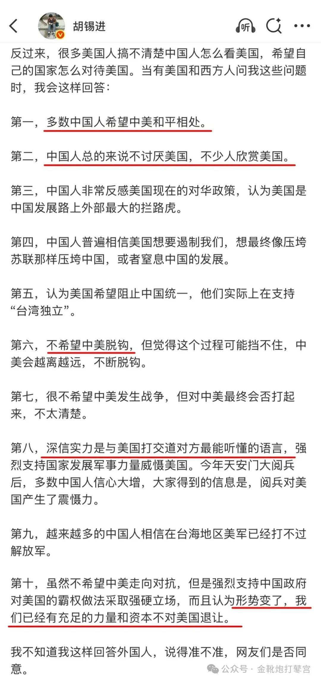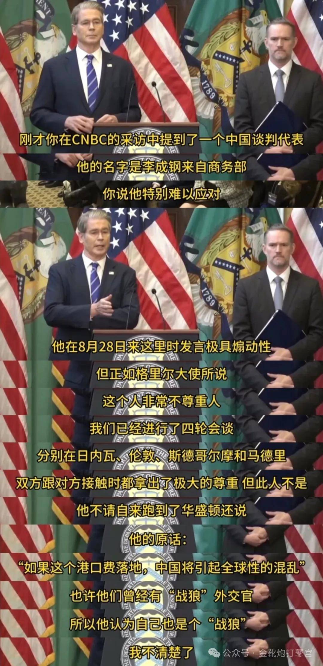 毛主席1936年在《反对投降活动》中曾有过一段雷霆发言: 我们共产党人公开宣称:我们是始终站在主战派方面的,我们坚决地反对那些主和派……我们向他们说:你们这种分裂阴谋的实质,不过是你们实行投降的准备步骤,而你们的投降政策和分裂政策不过是出卖民族利益、图谋少数人私利的整个计划的表现;每个人民都有眼睛,你们的阴谋会被人民揭穿的。 各位,可以关注一下李成钢。 这位同志被太君(美财长斯科特·贝森特)反向认证了。 还记得今年5月份彼时震动全球的中美日内瓦谈判吗? 那份当时让中国成为世界上几乎唯一一个“对美不跪之国”的《中美日内瓦经贸会谈联合声明》,李成钢正是幕后功臣。 为什么是瑞士(日内瓦)?这正是李成钢其谈判核心地位之体现——他曾是我国常驻WTO代表、特命全权大使,还兼常驻联合国日内瓦办事处和瑞士其他国际组织副代表。 阿尔卑斯山下,那是李成钢“轻车熟路”的地盘。 今年3月,李成钢结束四年之久的瑞士经历,回到商务部,被任命为正部级的商务部国际贸易谈判代表,同时兼任副部长。 回望李成钢过往履历与公开发声历史,可以一窥其人身位。 早在2012年底(那个时候十八大刚刚开过而已)的第二届全国商务法律年会上,李成钢曾代表商务部发言: 在商签投资协定时既不宜过分强调‘东道国留权’,但也不能太过侧重‘投资者保护’,而应平衡立场,要充分考虑中国国情。 这番话在那个时代从一个商务部官员(条约法律司司长)口中说出还是很不容易的。 今年2月,也就是李成钢履新前夕,在WTO总理事会例会上,中国设置了“贸易动荡加剧及WTO的应对”议程,李成钢代表中方发言强调: 当下的贸易动荡以及对所有成员造成威胁的根本原因,是美方任意加征关税、采取单边措施。这些‘关税冲击’加剧了经济不确定性,扰乱了全球贸易,并可能引发国内通胀、市场扭曲,甚至是全球经济衰退。 这已经预示了我们春夏之交时将“国际贸易谈判代表”这一重要职务交付于他是带有特殊使命给予的,那就是对美关税谈判与贸易交锋。 3月底履新后不到三天,特朗普“如期”发动关税战争,走马上任的李成钢也就开始了自己的工作,特别是瑞士那段经历起到重要作用。 这一次和七年前比,我们明显主动太多了,并且大有世界秩序维护者的正义之势: 4月下旬,瑞士联邦主席祖特尔和外交部部长伊尼亚齐奥·卡西斯,分别访问美国和中国,且都在事先公布的行程之外,并均谈及贸易关税事宜。 这已显示不同寻常(下图中的“周四”指4月24日)。 5月7日,外交部发布消息: 何副总将于5月9日—12日访问瑞士,期间与美方举行会谈。 同时还强调: 美方近期不断表示,希望同中方进行谈判。这次会谈是应美方请求举行的,中方坚决反对美国滥施关税这一立场没有任何变化。 两天后,李成钢露面: 再三天后,阶段性会谈在日内瓦圆满结束,中国以超乎所有人预期的结果取得了一场巨大的短期胜利。 这场胜利在当时甚至一度鼓舞了包括欧洲、日本、印度在内的其他经济体,均表达了对美强硬姿态。 而低调的李成钢,几乎一战成名。 近半年之前,面对记者对《中美联合声明》何时发布的催促,李成钢同志翩然一咲,淡定处之: 中国有句老话,叫‘好饭不怕晚’~ 羽扇纶巾,谈笑间,樯橹灰飞烟灭。 随着被美方高层“点名”而由此彻底进入西方各个智库研究名录的李成钢的“走红”,某种与过往“惊诧友邦”论调完全相悖的新时代外交商贸思路已然呼之欲出。 毛主席当年在《论十大关系》中为某部分热衷“友邦惊诧”之人描摹的画像堪称一绝: 有些人做奴隶做久了,感觉事事不如人,在外国人面前伸不直腰,像《法门寺》里的贾桂一样,人家让他坐,他说站惯了,不想坐。 看看近些年这些人的做派,我们反腐是不对的,因为会“友邦惊诧”;我们抗疫也是不对的,因为会“友邦惊诧”;我们阅兵是不对的,因为会“友邦惊诧”;甚至我们在伊丽莎白、安倍晋三亡命时不陪着他一同披麻戴孝泪奔哭丧,也是不对的,也是会“友邦惊诧”…… 我只能说,怪不得当年哈佛大学教授尼尔·弗格森敢于发明“中美夫妻论”这个概念: 美国和中国之间的婚姻就像我和我的老婆,中国负责存钱,美国负责消费。 因为山姆大叔太知道了,咱这边的某些势力辫子是永远剪不完的,春天来了,便会春风吹又生。 上图这句“形势变了,我们已经有充足的力量和资本不对美国退让”,真是叫人摸不着头脑。 姑且认为胡某人是在将今时今日与八九十年代做对比,可即便如此也不应如此惊媚——难道“不对美国退让”之于新中国而言是一种很陌生的图景吗? 看来昔日那个敢当着全世界的面击落美国U-2战机的新中国,是早已被胡某人遗忘在脑后了。 回望1972年2月尼克松访华时,曾留下了一个经典的画面:我们在机场不为所动得横挂了反对帝国主义、霸权主义的标语,用以欢迎“帝国主义世界的领袖”。 试问:“友邦惊诧”了吗? 然而,尼克松后来在自己的回忆录中依然不得不承认: 近二十年来,美国一直在世界上鼓吹和带头孤立、封锁新中国,不但没有奏效,反而招致了自己对华利益的巨大损失。 美国再也不能像过去那样无视新中国的存在了! 不论是苏修社会主义还是美帝国主义,为什么他们会惧怕毛主席? 换句话说:为什么毛主席从无畏惧苏修和美帝?为什么毛主席从无考虑“友邦惊诧”? 早在新中国