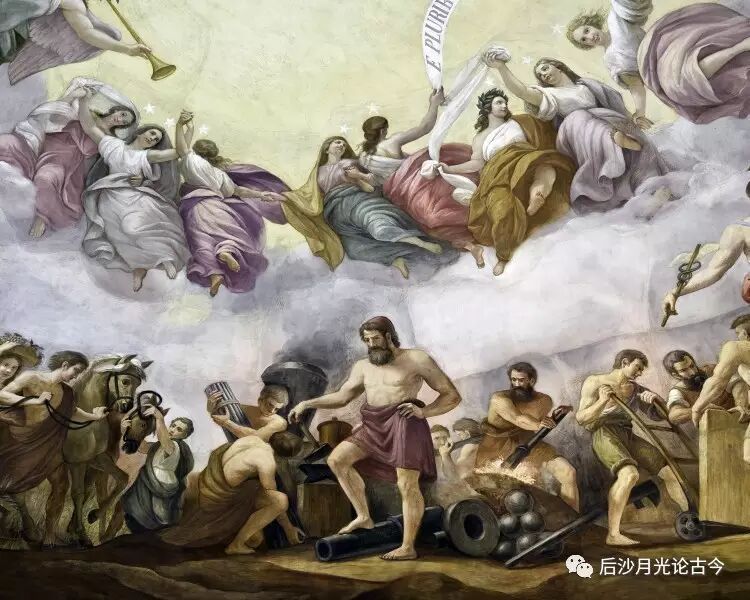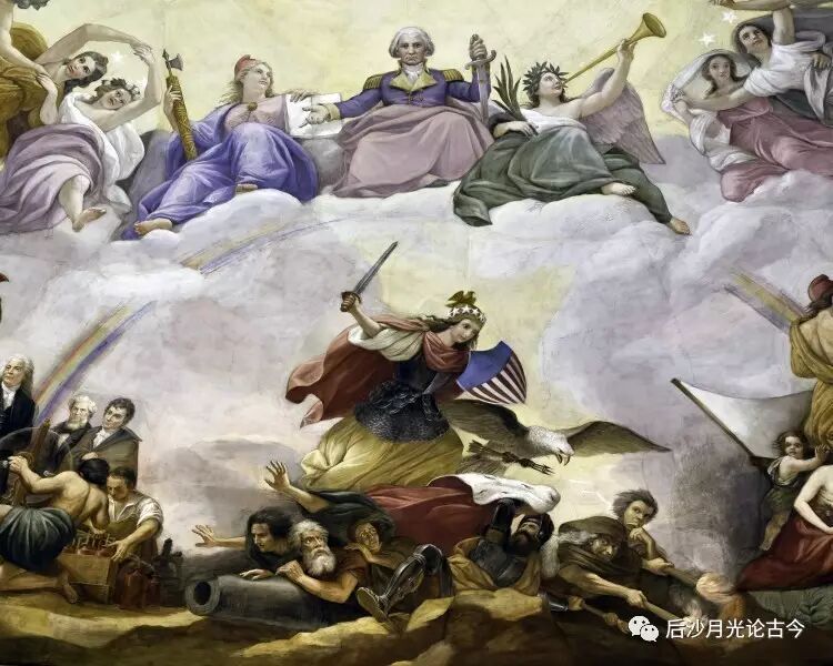 构图中:华盛顿身穿象征权力的紫色衣袍,脚踩云霞。边上绕着他的女人,可不是普通人,全是古希腊,古罗马的女神们。直接告诉你一个道理:他是众神之神。