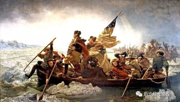 1776年12月25日,圣诞夜,华盛顿渡过特拉华河,偷袭英军,获得了独立战争中的一场重要的胜利。 背景是浓雾中的一片光明,华盛顿同志就在这光芒的显眼处。身姿英挺,目光坚毅,注视着远方。当然,划船这些体力活肯定不干!