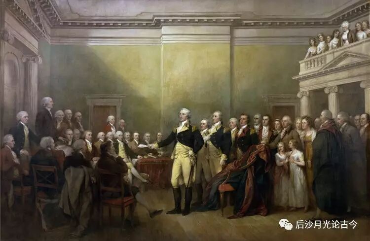 1783年12月23日,在担任两任总统后,华盛顿被迫交了兵权,辞去联邦军总司令职务。对面全是议会大佬。 站立者是议会主席米夫林,边上是杰佛逊,议会是在阴影中,华盛顿是在光明中,他身边椅子上的披风,象征着不是军权,而是王权。 后来,这场权力博奕,被美化成“民主”思想的象征。原先他和汉密尔顿的想法是力求终身总统。最后没成功,而大法官却能终身。 这些油画,只是让你在参观时对华盛顿事迹有一些初步了解。神化马上就要开始。