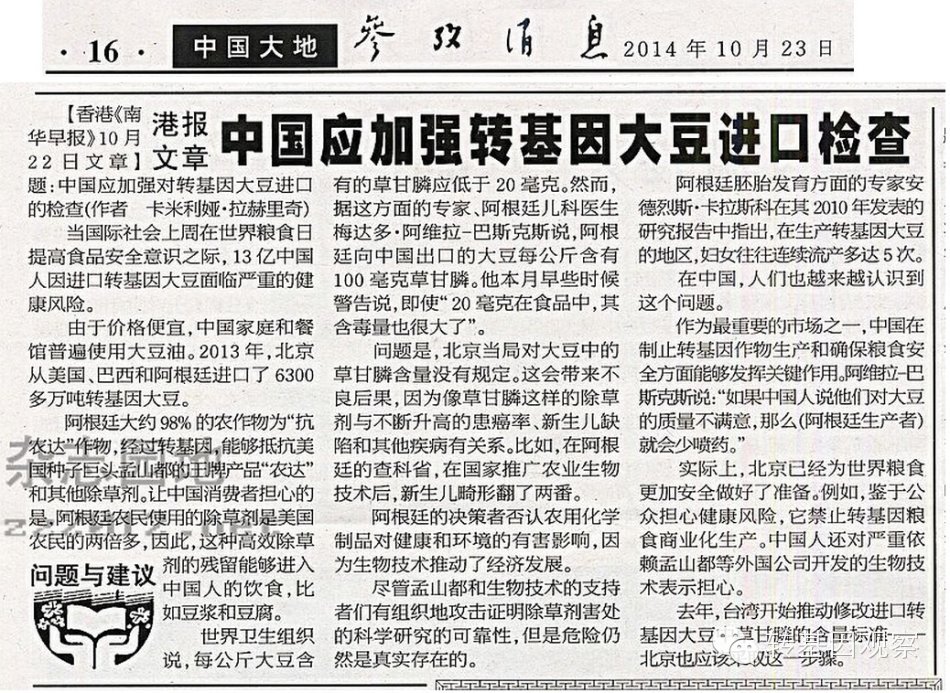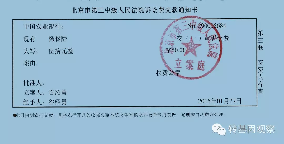 北京市民状告农业部正式立案 文/转基因观察(点击右上方关注) 转基因观察了解到,近日有北京市民起诉中华人民共和国农业部一案已正式立案,案件将由北京市第三中级人民法院的审理。北京市三中院于今天正式下达了《行政案件合议庭组成人员告知书》。 这起民告官的案件与目前社会争论极大的转基因有关,三位北京市民就农业部信息公开答复问题发起行政诉讼。这起案件正式进入司法程序,不仅意味着“民告官”的重大进展,也有望为当前转基因困局寻找到新的解决渠道。 状告农业部获立案 因转基因问题,农业部一直站在风口浪尖。知名主持人崔永元、律师黄乐平等均向农业部发起挑战。这次,一位普通市民因转基因起诉农业部有了实质性的进展。 诉讼案的原告杨晓陆向转基因观察介绍:“前几天,北京第三中级人民法院法庭通知我去交诉讼费,我当天下午就赶去交了50元一审诉讼费,等于我们状告农业部正式立案了”。 杨晓陆特意转来了三中院诉讼费交款通知书,其中写到“七日内到农行交费,且将农行开具的收据交至本院财务室换取诉讼费专用票据,逾期按自动撤诉处理。”另一张人民法院诉讼收费专用票据显示,本起案件的受理费、申请费为50元,诉讼收费单位为北京市第三中级人民法院。 就在今天(2月11日),三中院通知杨晓陆去领回农业部的答辩状、证据、以及合议庭组成名单等。本次案件将采用合议庭形式审理,由一名审判长两名法官组成合议庭。告知书称,当事人认为审判人员与本案有利害关系可能影响公正审判的,有权申请回避。 杨晓陆说,自己只是一位土生土长的北京市民, 2009年农业部颁布转基因水稻安全证书,引起社会广泛关注,他从那时起就开始关注转基因问题。 2010年的一天,杨发现他在超市买的大豆油原料均为转基因大豆,他才意识到自己吃了转基因多年。而主流科学界称转基因安全无害,但这并不能消除他的疑虑,出于对安全性考虑,他曾多次向农业部申请转基因大豆的安全评价信息。 在了解到转基因大豆与草甘膦的关系后,杨晓陆于2014年2月10日又向农业部提出信息公开申请,要求公开被告批准孟山都公司草甘膦除草剂“农达”进入中国市场、对其颁发“安全证书”所依据的中国有资质机构完成的毒理学动物试验报告。 农业部于2014年2月25日作出《农业部信息公开申请答复书》(农公开(农)[2014]4 号),告知:孟山都公司草甘膦除草剂“农达”于1988年在中国取得农药正式登记,按照当时的农药登记规定,孟山都公司提交了由美国Younger Laboratories于1985年12月23日出具的毒理学试验报告。 2014年3月11日,杨晓陆又向农业部提交了政府信息公开申请,要求其公开孟山都公司1988年提供的草甘膦除草剂“农达”毒理学试验报告原件扫描件及英文报告的中译本。 2014年3月28日,农业部作出《农业部信息公开申请答复书》(农公开(农)[2014]5号),告知其申请的试验报告因涉及孟山都公司的商业秘密,根据《政府信息公开条例》第十四条、第二十三条的规定,巳书面征求孟山都公司意见,孟山都公司尚未答复意见;根据《政府信息公开条例》第二十四条的规定,行政机关征求第三方意见所需时间不计算在办理期限内。 经过长时期间的等待,2014年6月4日,农业部作出《农业部信息公开申请答复书》(农公开(农)[2014]8号),以孟山都远东有限公司北京代表处巳复函认为试验报告系该公司重要的商业秘密,含有重要的个人隐私及商业保密信息,在全球范围从未向公众公开过,不同意公开该报告为由,宣称依照《政府信息公开条例》第十四条、第二十三条的规定对相关政府信息不予公开。农业部同时告知杨晓陆, 2014年2月25的公开即是试验报告结果的公开。 杨晓陆认为,农业部拒绝公开草甘膦除草剂“农达”毒理学试验报告原件信息既不合理,也不合法,“这个信息是否涉及商业秘密不能由孟山都公司自行界定,因为这涉及到十几亿人民的食品安全问题,不能由利益相对方自行定论。” 转基因与草甘膦 “关注转基因,为何关注起了草甘膦?”转基因观察了解到,目前国内进口的转基因大豆都是抗草甘膦的转基因品种,这种转基因大豆就是为抗草甘膦除草剂而设计,由于除草需要大量人工,而大量喷撒草甘膦后,转基因大豆不会死而杂草会死,这节省人工成本,但这样的后果是,转基因大豆本身会含有草甘膦残留。 由于我国国家标准GB2763-2005《食品中农药最大残留限量》(2012年修订版依然如此)对大豆的草甘膦允许残留量未作限制,其直接后果是,全世界草甘膦残留量最高的转基因大豆均流向我国。 目前,我国已成为世界最大的转基因大豆进口国,2013年,我国进口了6300多万吨转基因大豆,2014年,大豆进口量达到7100万吨,其中绝大部分都是转基因的大豆。由于未作充分的安全性评估,我国既不知道这些大豆的草甘膦含量,更不知道其对人体健康的影响。 《参考消息》2014年10月一篇文章曾发出警告《中国应加强转基因大豆进口检查》,文章提到,世界卫生组织说,每公斤大豆含有的草甘膦应低于20毫克。然而,阿根廷向中国出口的大豆每公斤含有100毫克草甘膦,13亿中国人因进口转基因大豆面临严重的健康风险。 但长期以来,孟山都宣传草甘膦低毒、无害。“草甘膦绝非是低毒无害的农药,农民喝农药自杀就经常选择草甘膦。”有过农村生活经历的杨晓陆说。 转基因观察从农