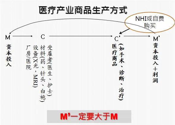 从台湾成功大学陈美霞教授所做的这张图里,我们可以发现医院挣钱的奥秘。M是医疗资本投入的资金,C是用这些资金购买的生产资料(医院、医疗设备、药品等)和劳动力(医生),C’是医生用这些生产资料提供的医疗产品(如手术、诊断、治疗等),M’是出售医疗产品后获得的的货币收入。资本的目的就是增值,医疗资本投资的目的是为了获得尽可能多的利润,因而必须要保证把医疗商品销售出去之后,所获得的货币收入M’大于投入的资金M。而要获得更多的利润,就需要从两方面下工夫。